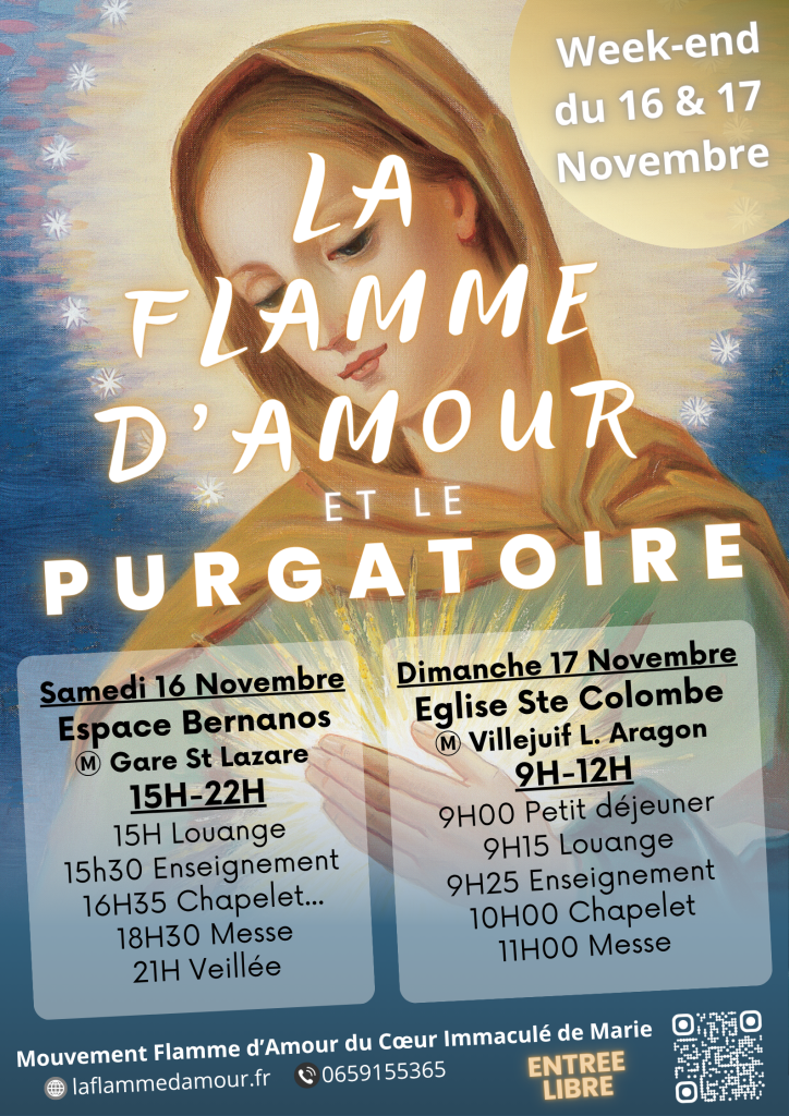 Le 17 novembre, nous avons présenté le même sujet en accéléré à la paroisse sainte Colombe de Villejuif (94 Val-de-Marne). Dans cette église, le prêtre doyen a pu assister un peu à nos présentations puis invité les paroissiens à prier plusieurs Je vous salue de la Flamme d’Amour, suivant nos « Livrets en bref » mis à disposition sur les bancs.
